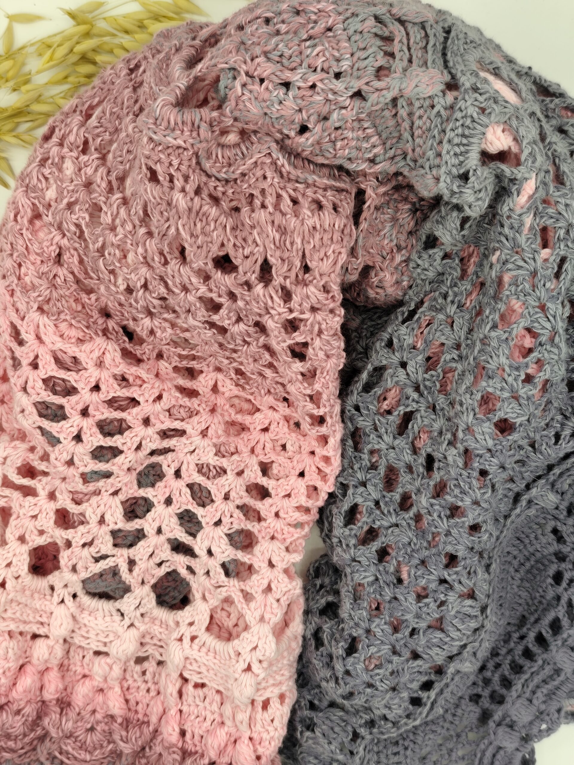Máte dotaz k produktu? Zanechte mi kontakt.Ručně háčkovaný půlkruhový šátek v barvách růžové a šedé.