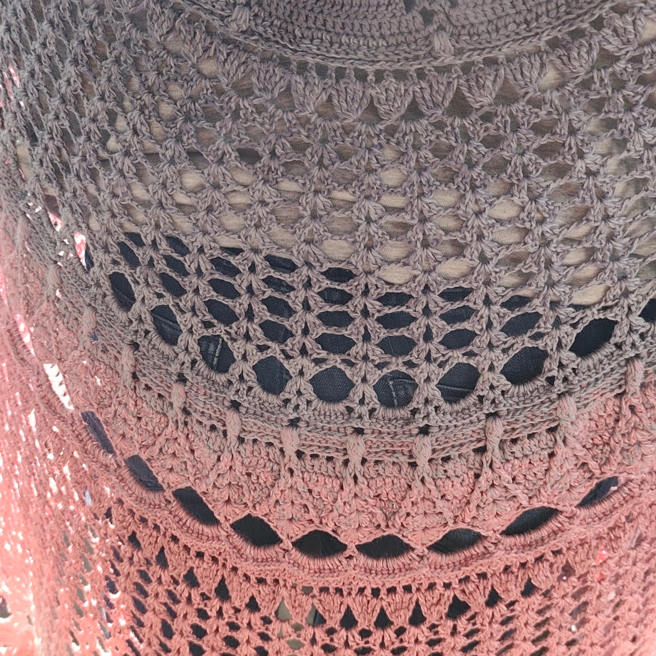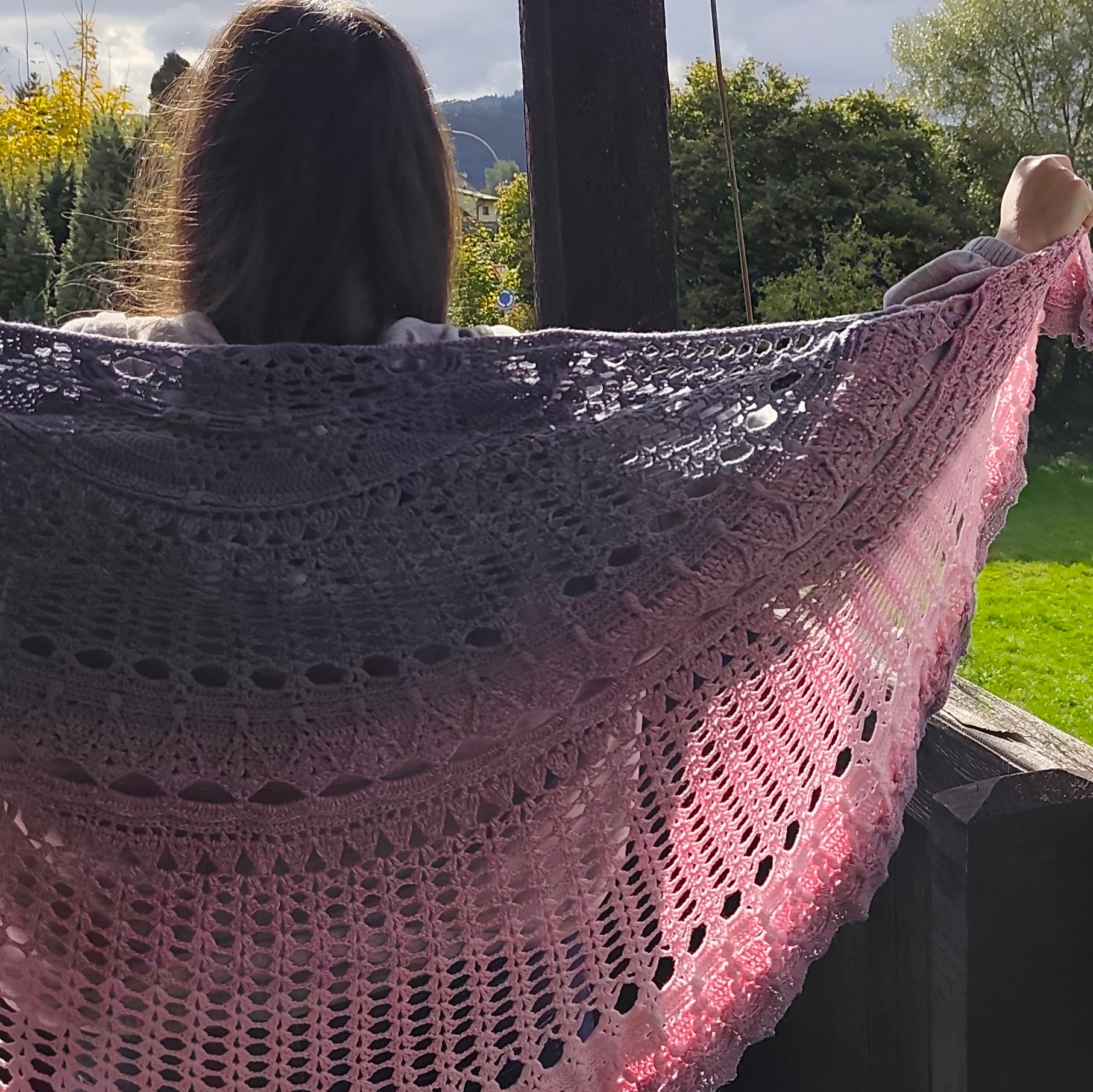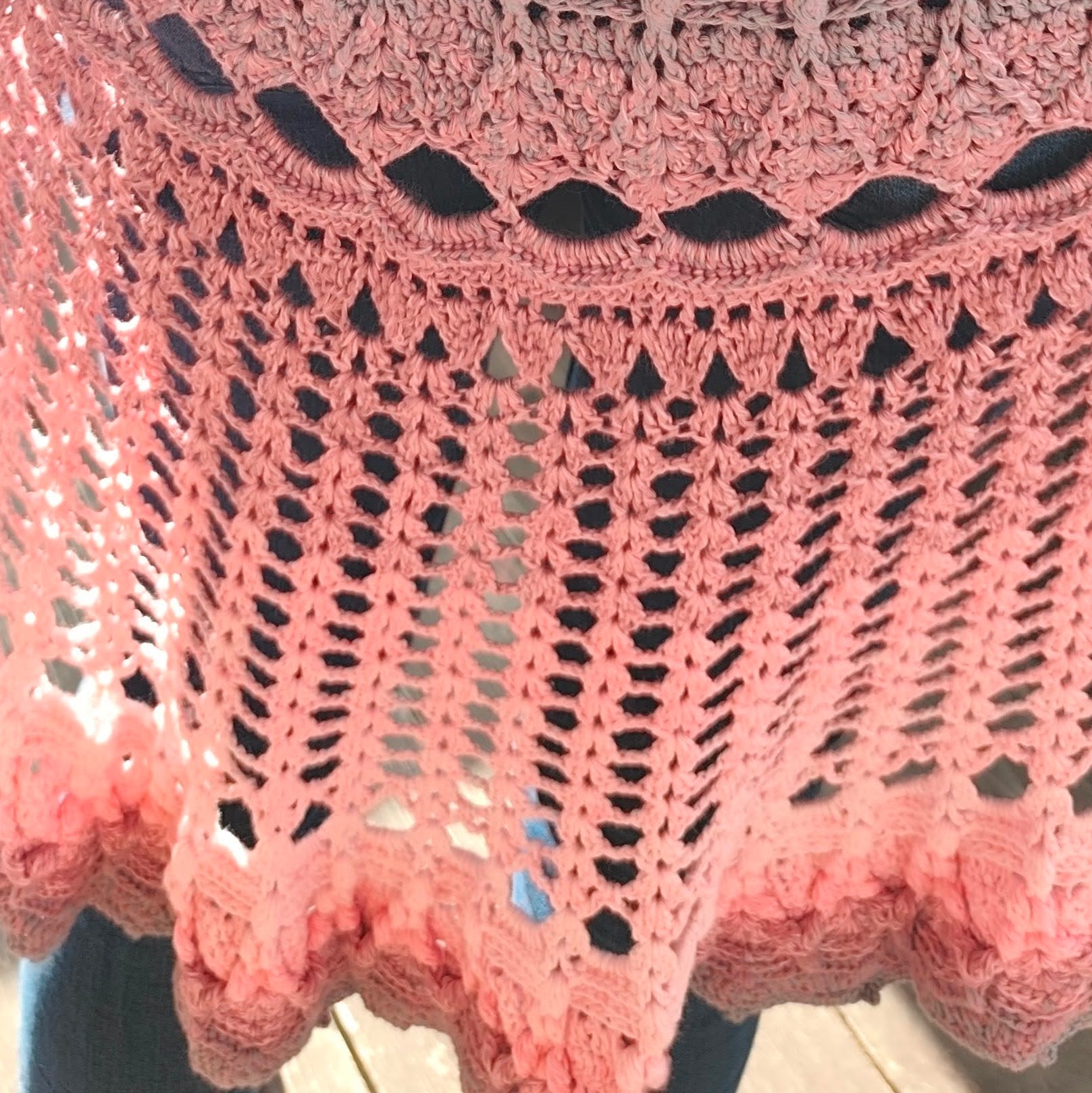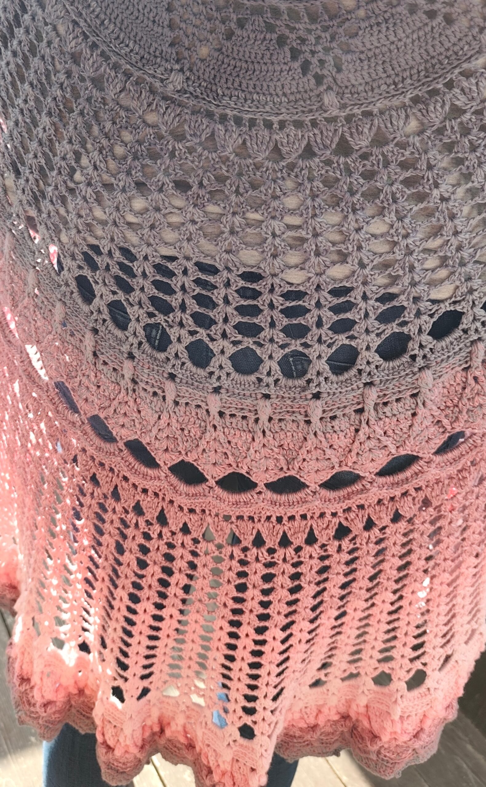 Bavlněný háčkovaný šátek Cirkle v tónech šedé a růžové v půlkruhovém provedení. Umíte se představit s tímhle šátkem přes ramena? Jasně, že ano. V létě ho využijete, když se ochladí nebo fouká a také k vodě jako pareo. Je tak velký, že jej můžete využít i jako pléd, když sedíte večer na pergole a nebo do něj zabalit svou ratolest, když není nic jiného po ruce.