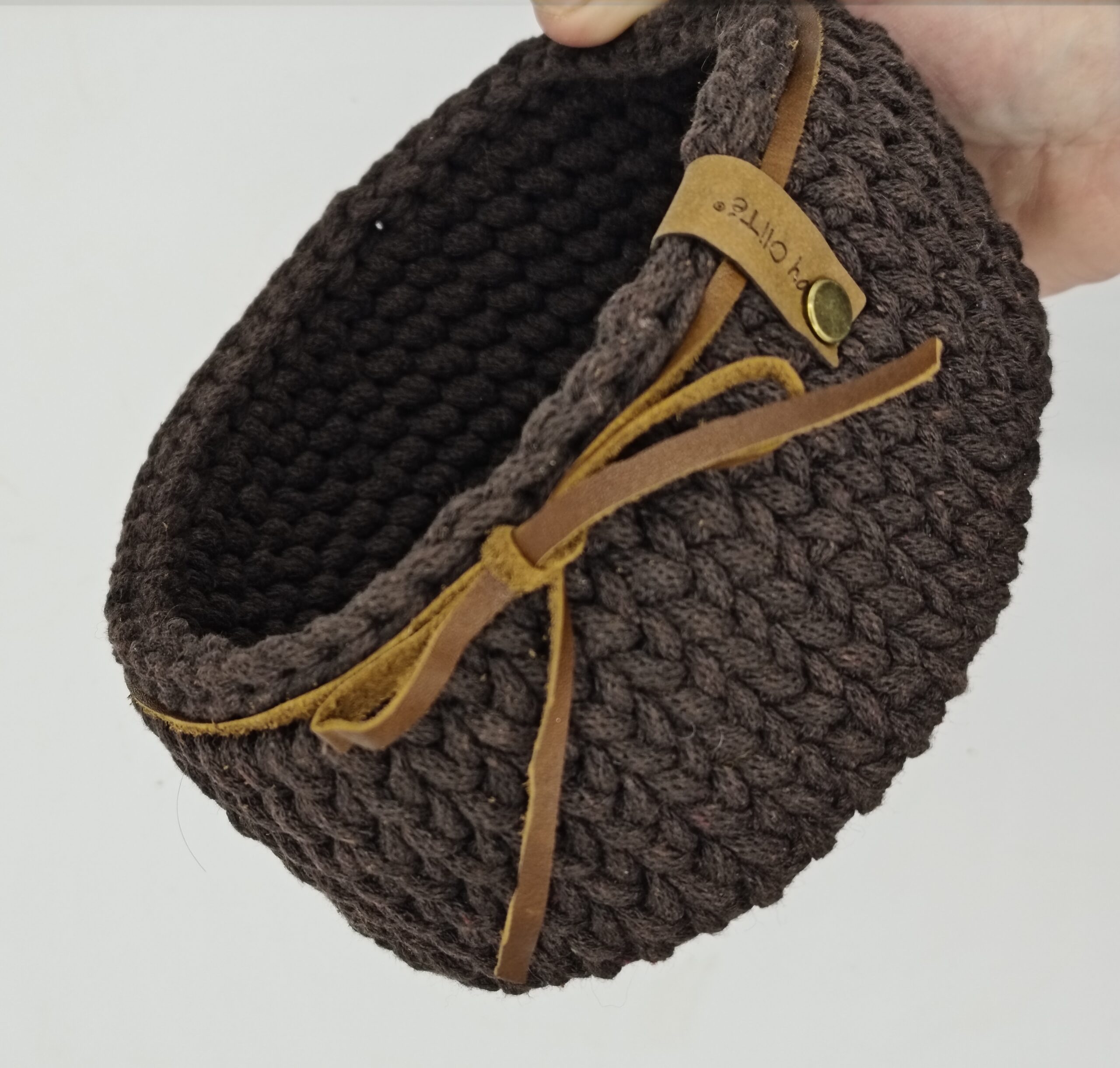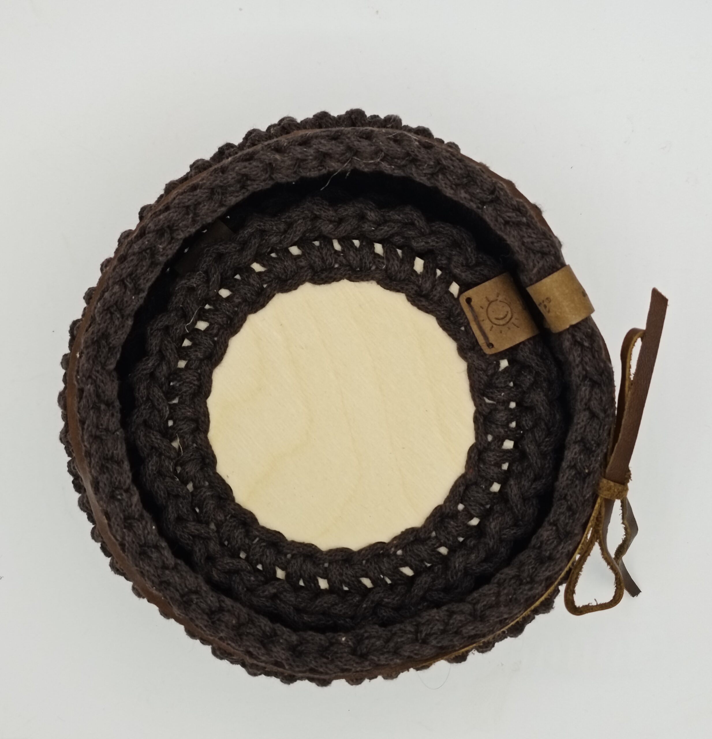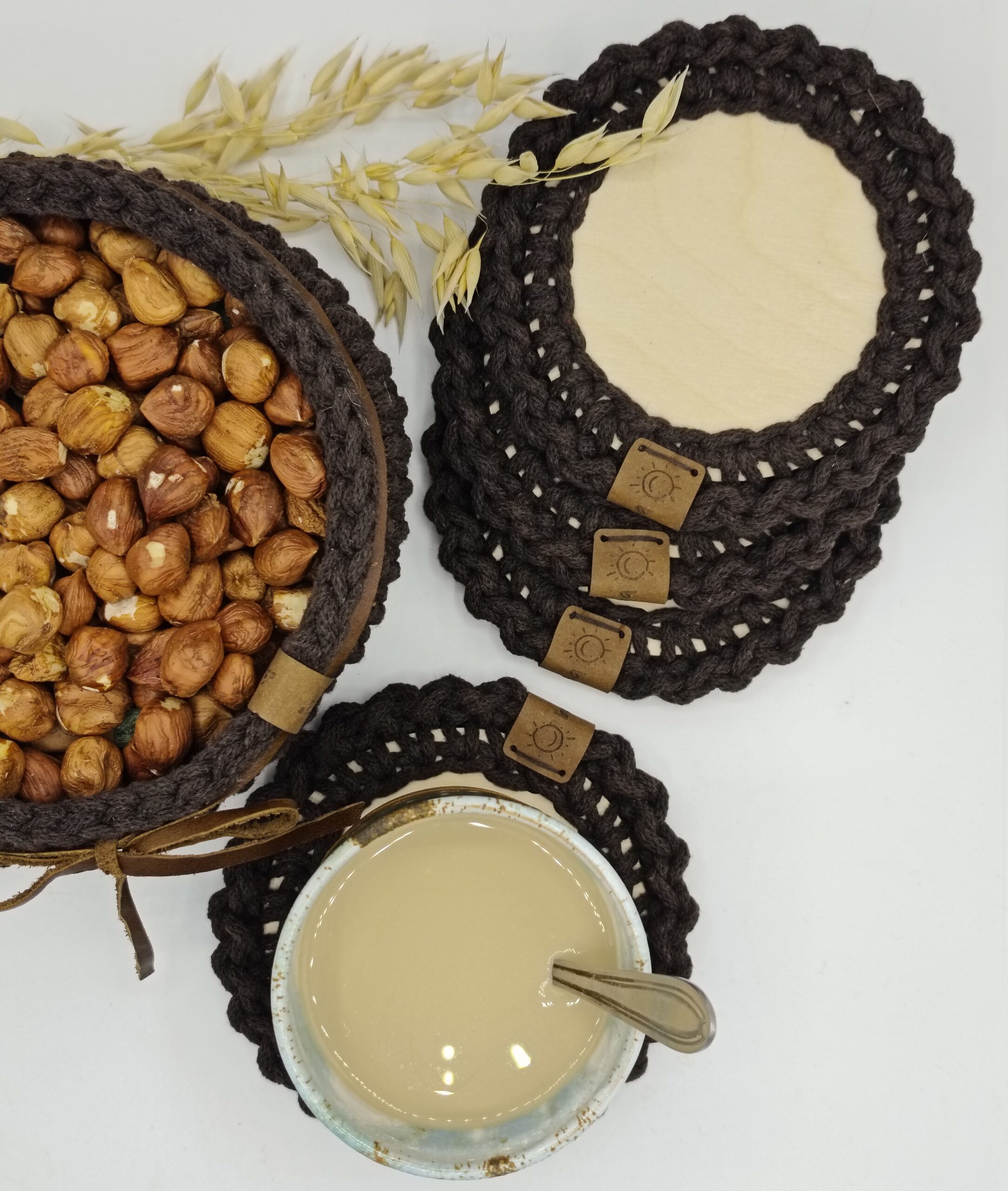 Háčkovaný košík s podtácky v hnědé barvě spojující přírodní dřevo s jemným háčkovaným lemem. Košíček je dozdobený koženou šňůrou. Praktický doplněk na váš stůl. Košík na ovoce, sušenky nebo ořechy, podtácky zase ochrání povrch stolu a zároveň působí esteticky.