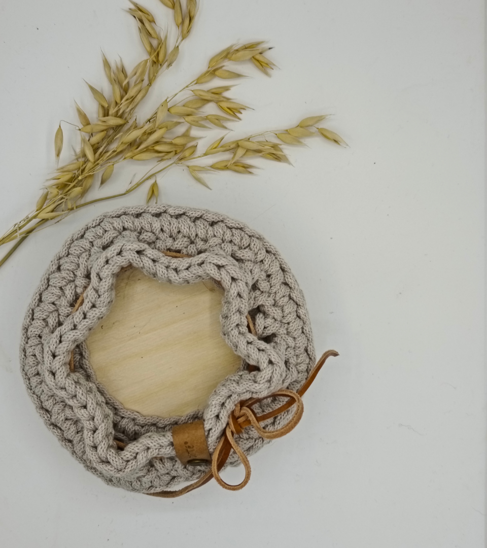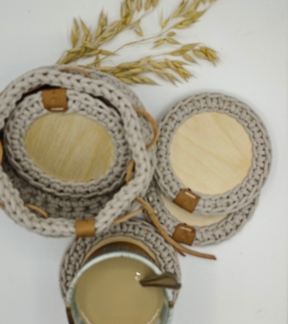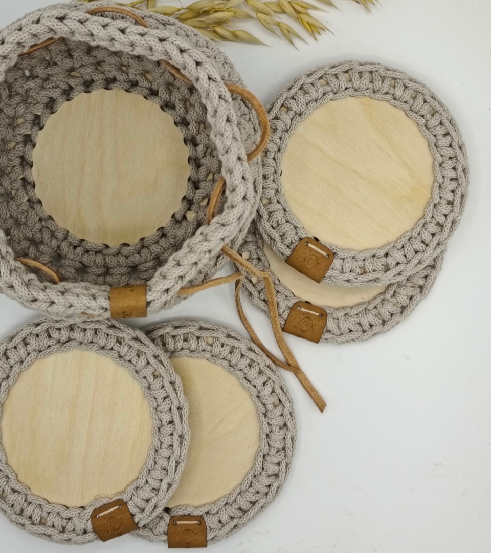 Háčkovaný košík s podtácky v latté barvě spojující přírodní dřevo s jemným háčkovaným lemem. Košíček je dozdobený koženou šňůrou. Praktický doplněk na váš stůl. Košík na ovoce, sušenky nebo ořechy, podtácky zase ochrání povrch stolu a zároveň působí esteticky.