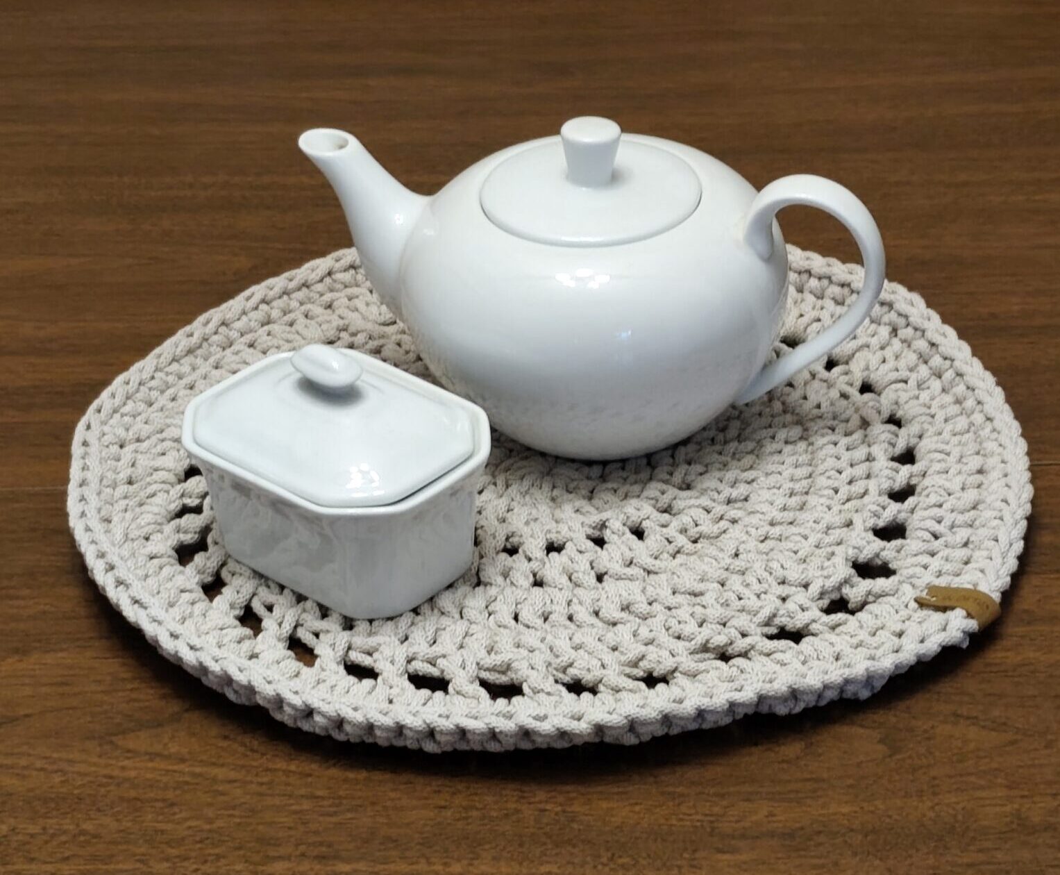 Máte dotaz k produktu? Zanechte mi kontakt.Háčkovaný košík s podtácky v latté barvě, neotřelý doplněk na váš stůl.