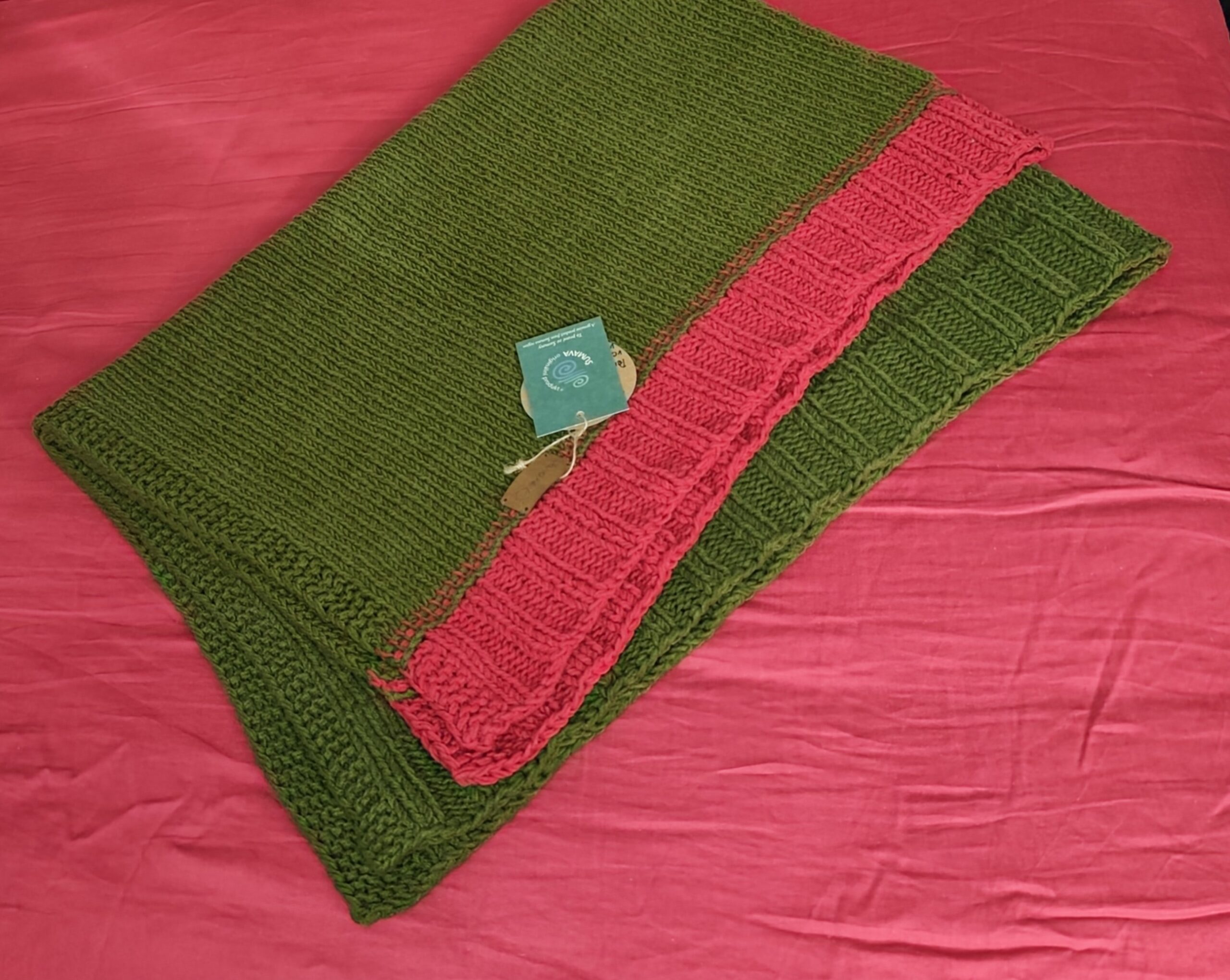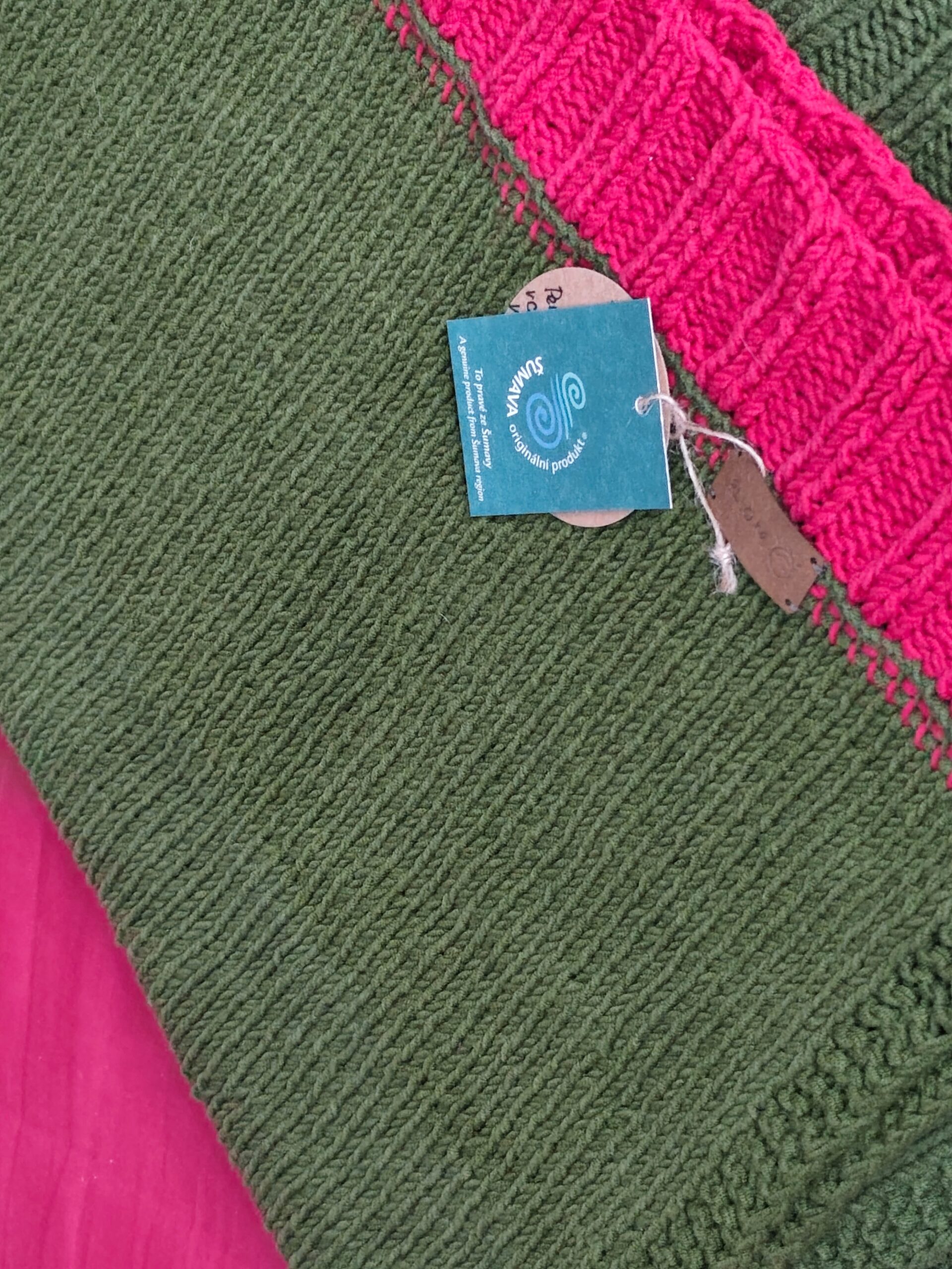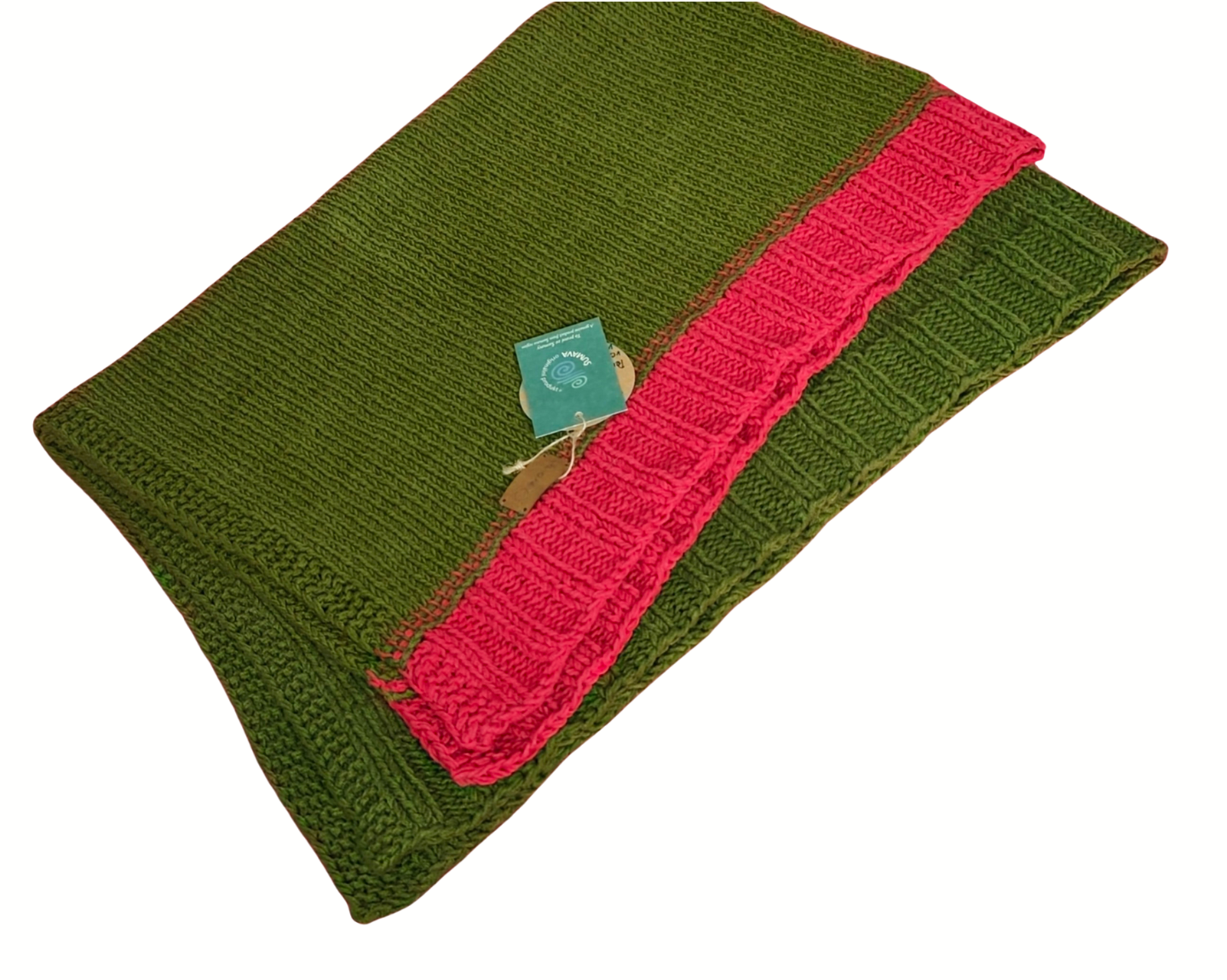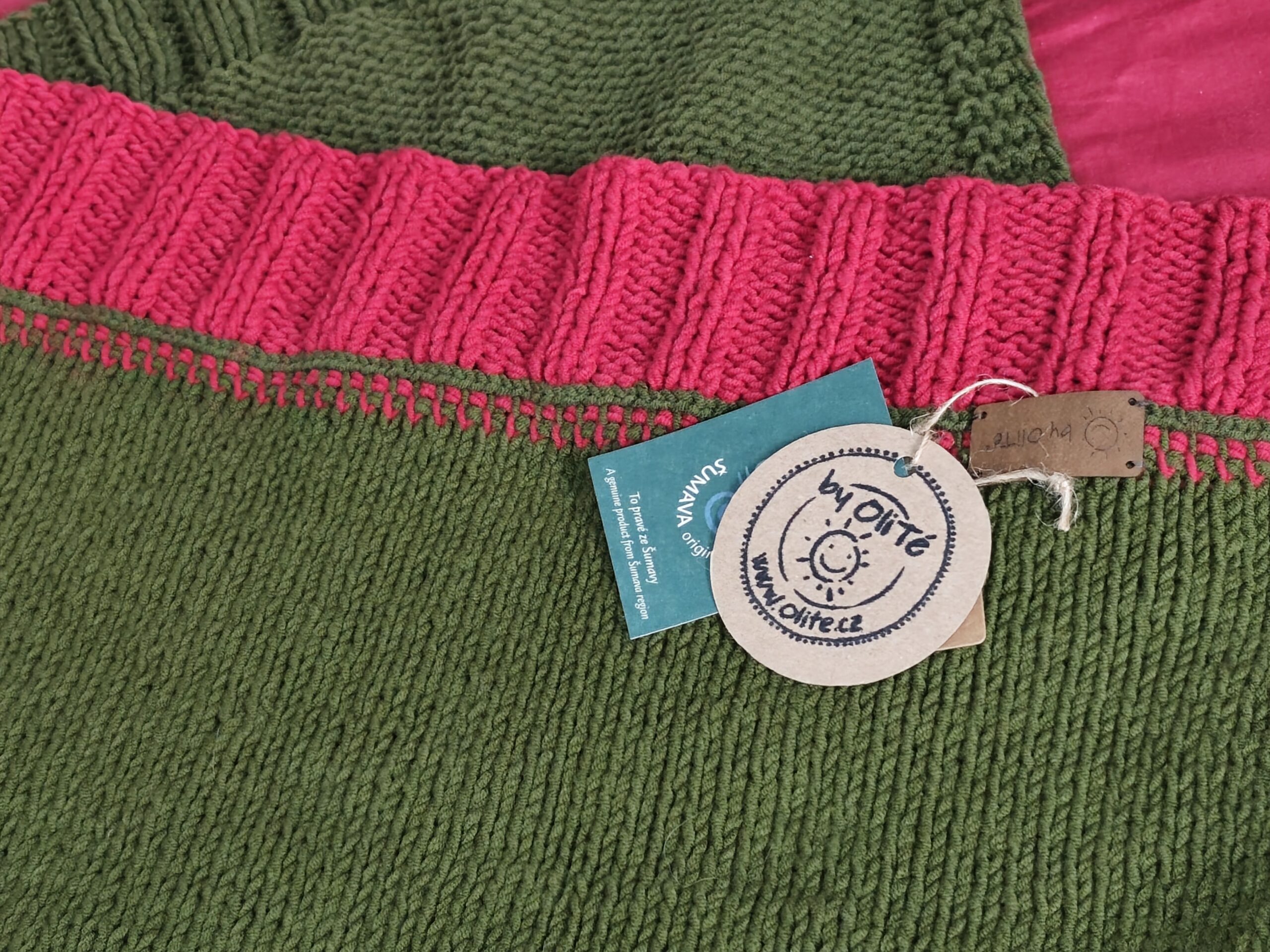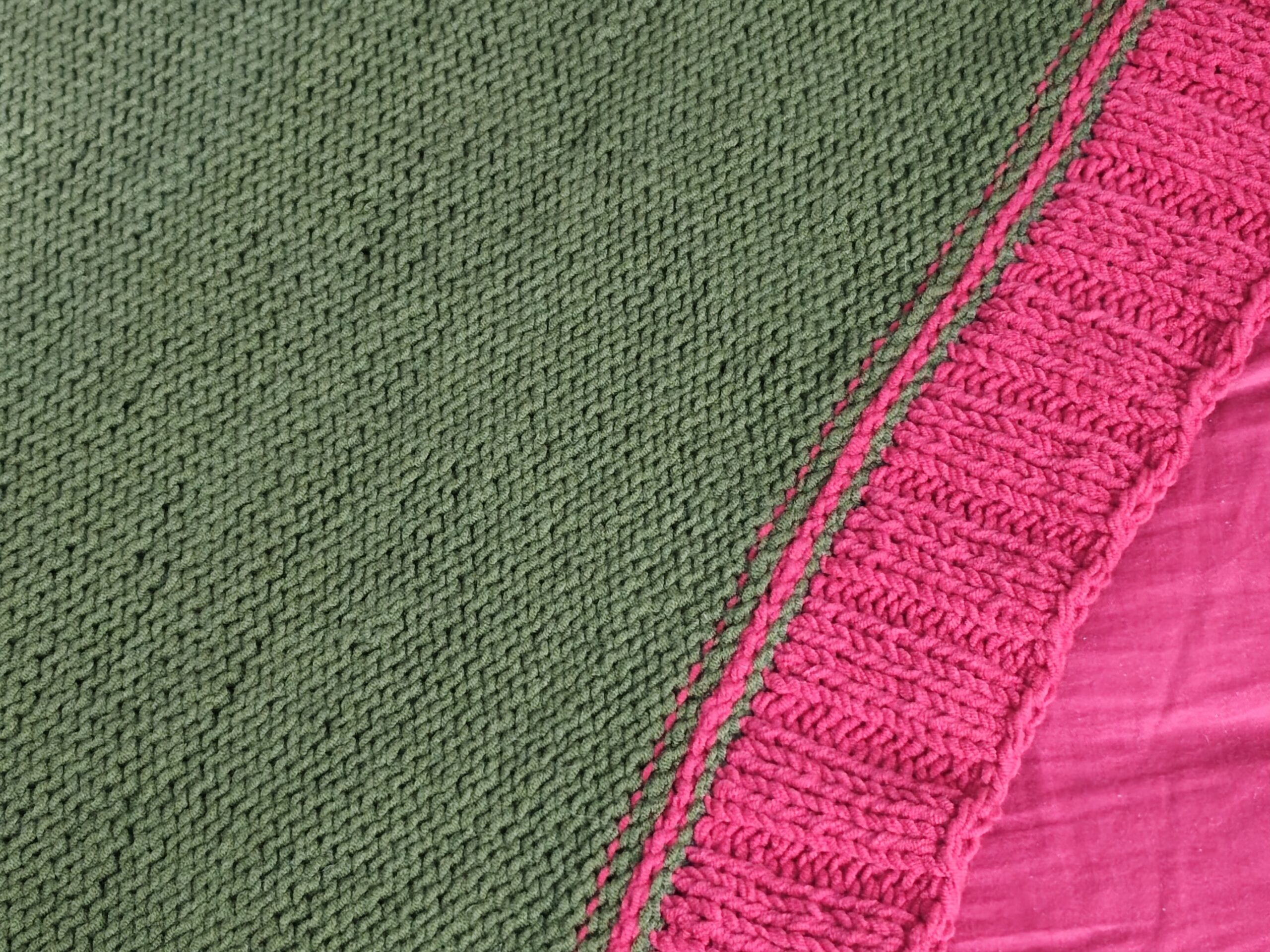 Pletená deka pro miminko z příze s vysokým podílem bavlny v unisex zelené barvě s tmavě červeným lemem. Deku využije dítko určitě do jeho 5 let. A kde? V postýlce, v kočárku přeloženou na polovinu, v autosedačce. Miminku na ní bude dobře na trávníku i na koberci jako podložka na hraní. Deka má trochu větší rozměr, než klasické přikrývky.