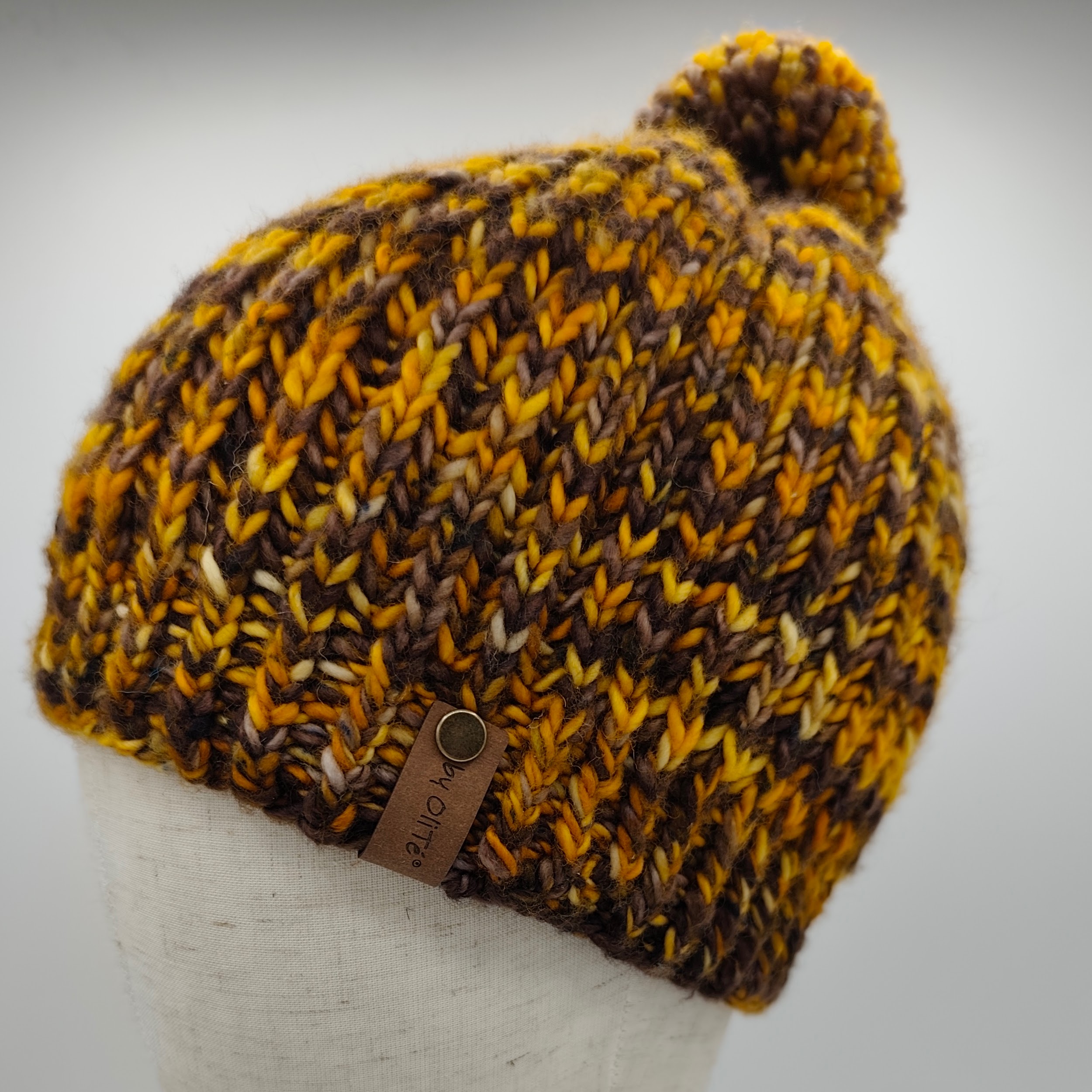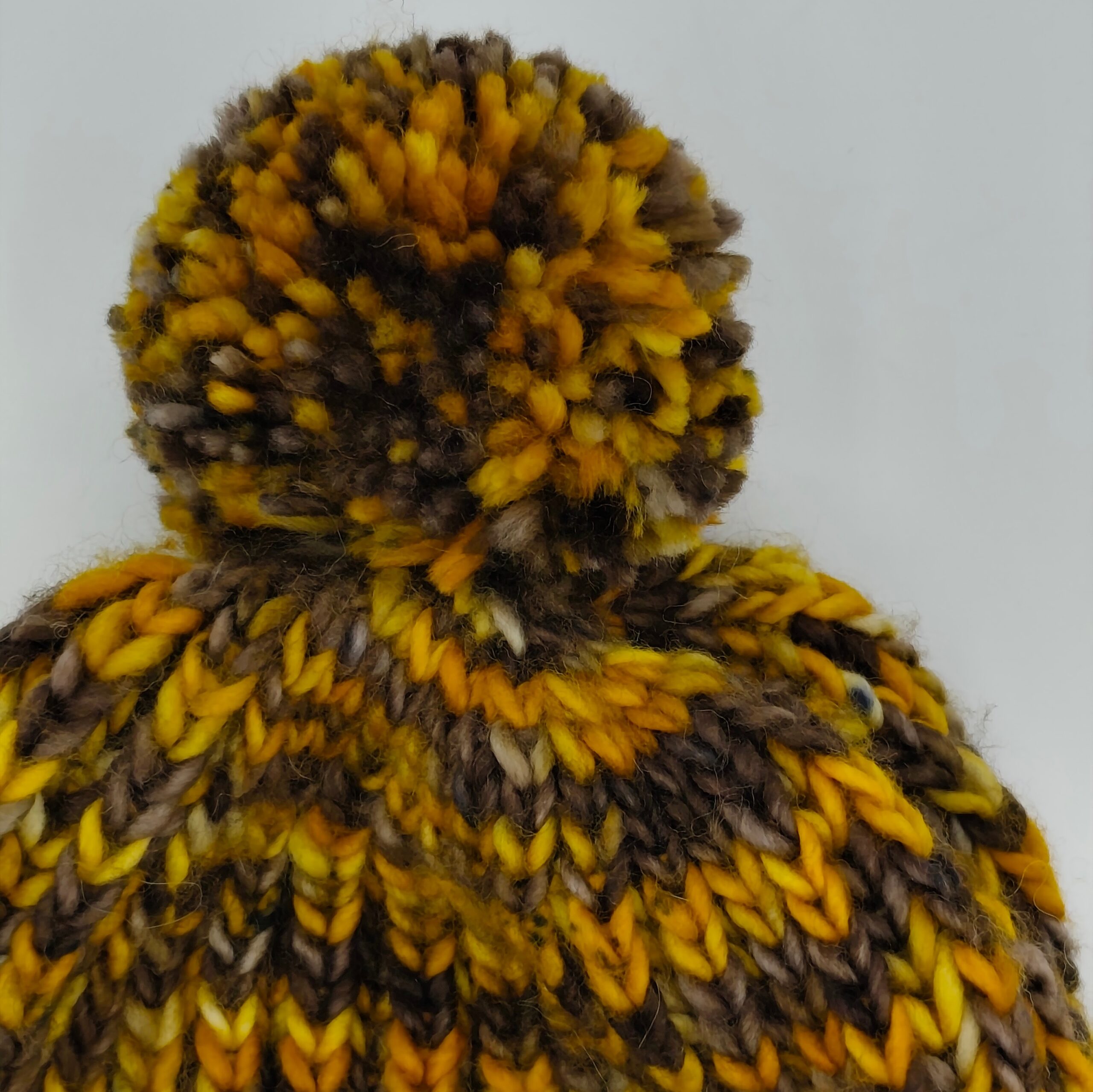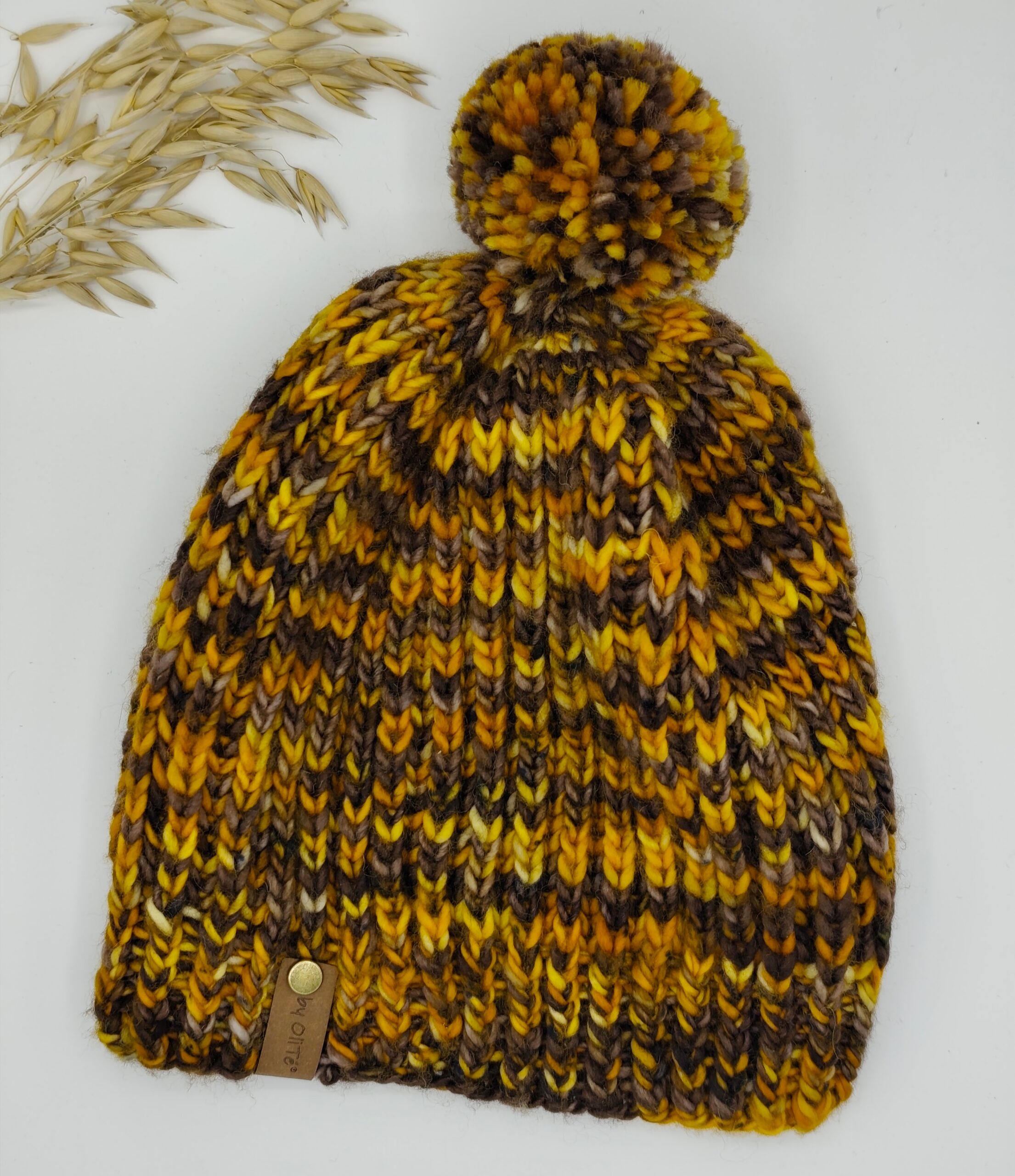 Vlněná čepice vícebarevná unisex pletená jako kratší kulich bez lemu s bambulí. Je vyrobena z ručně barveného merina v tónech žluté, oranžové a hnědé barvy. Merino je perfektním materiálem pro lidi s citlivou pokožkou, protože nekouše. Lehká a hřejivá čepice, ve které zvládnete všechny zimní aktivity. Prosím, měřte. Jak? Mrkněte sem.